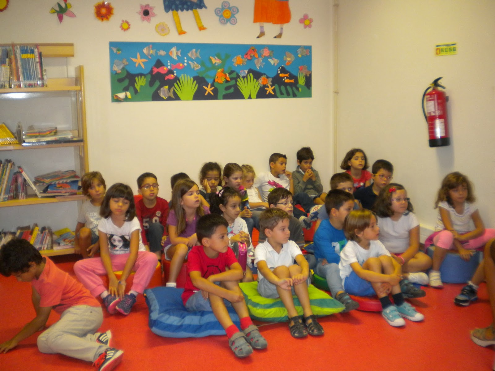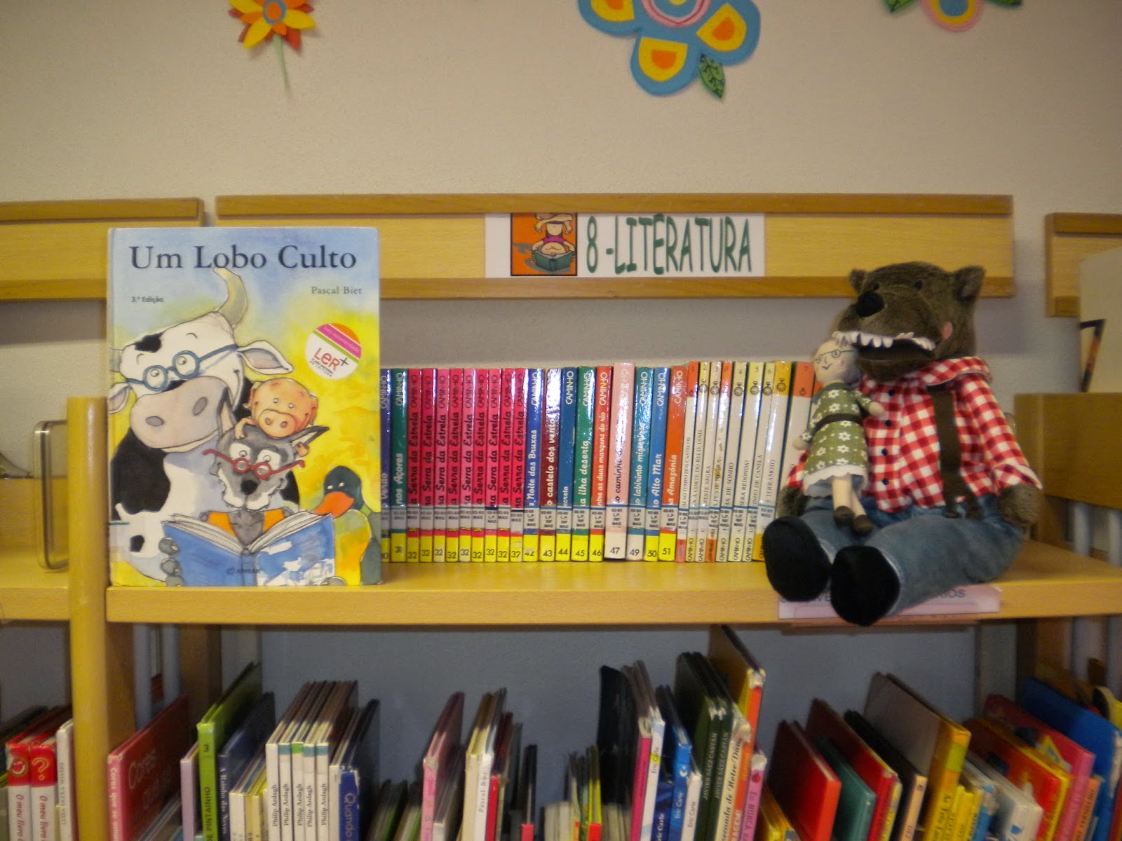 Depois sentaram-se muito quietinhos e ficaram a ouvir uma historinha. A história do “Lobo Culto” de Pascal Biet. Vejam como eles ficaram interessados. De certeza que vão voltar à biblioteca para serem como o lobo da história, cultos!