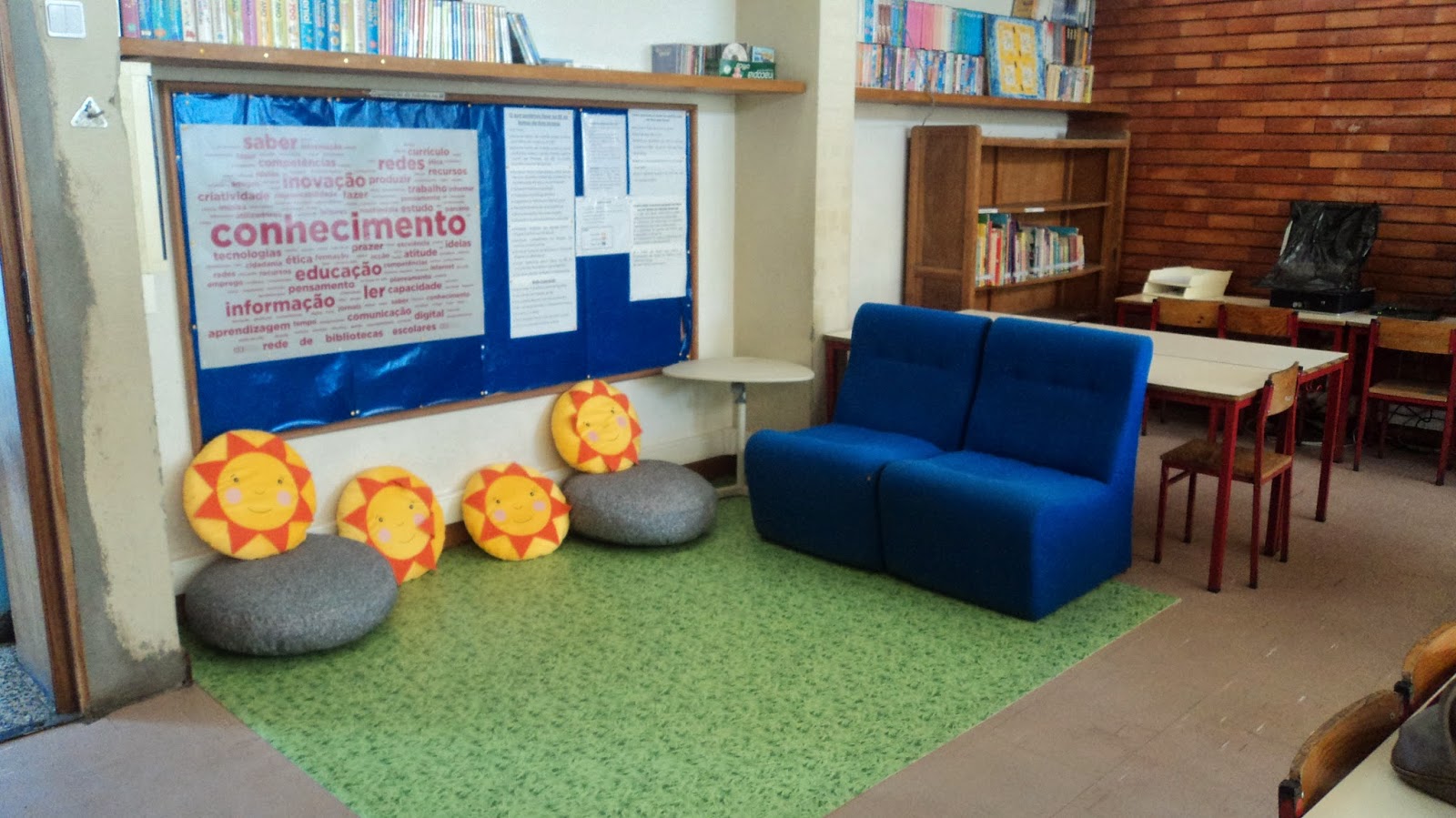 A biblioteca está agora organizada por espaços com o cantinho da leitura remodelado, a zona dos computadores, a zona de leitura e a zona de trabalho de grupo.