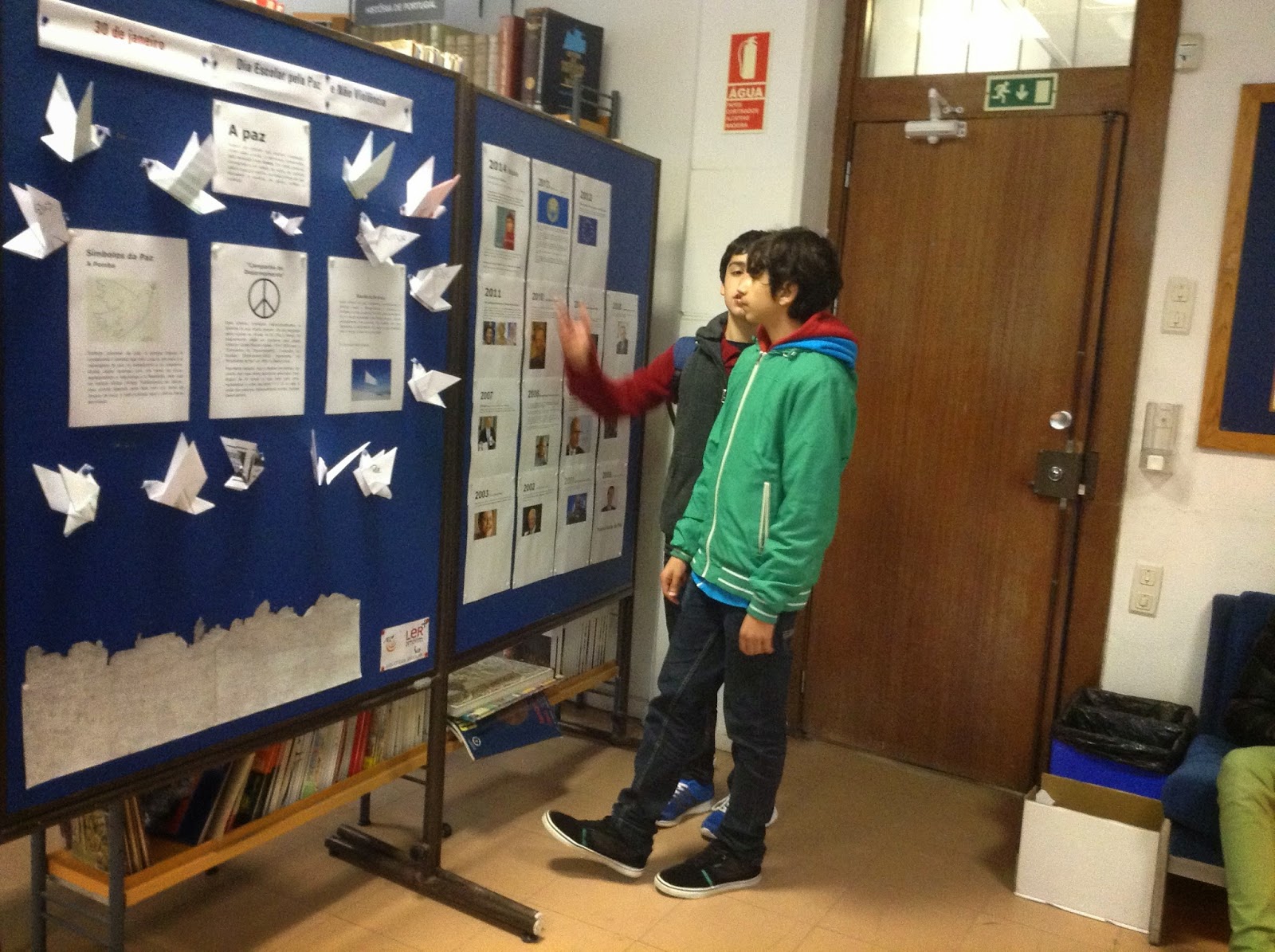 Hoje, na nossa Biblioteca, os alunos ficaram sensibilizados com a comemoração deste dia e colaboraram na execução de pombas em origami. Pombas que são um dos conhecidos símbolos da Paz.