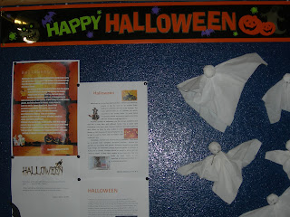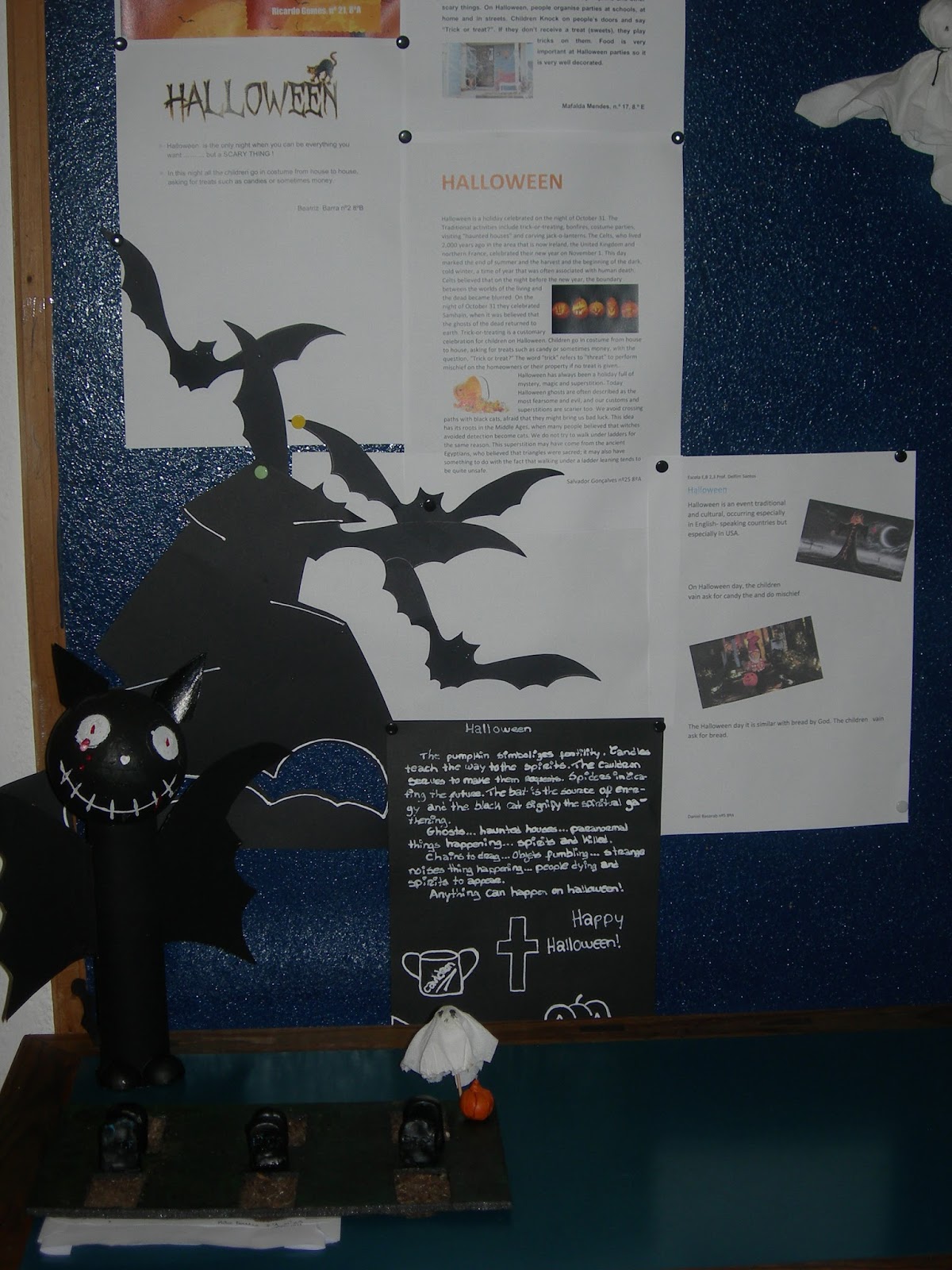 Nas aulas de Inglês da professora Vanda Gomes, os alunos ouviram falar da tradição do Halloween. Depois leram, escreveram textos em Inglês e ilustraram esta tradição. Os alunos do 5.º Ano, turmas G e F fizeram os fantasmas e os alunos do 8.º A, B e E escreveram os textos e fizeram maquetes.