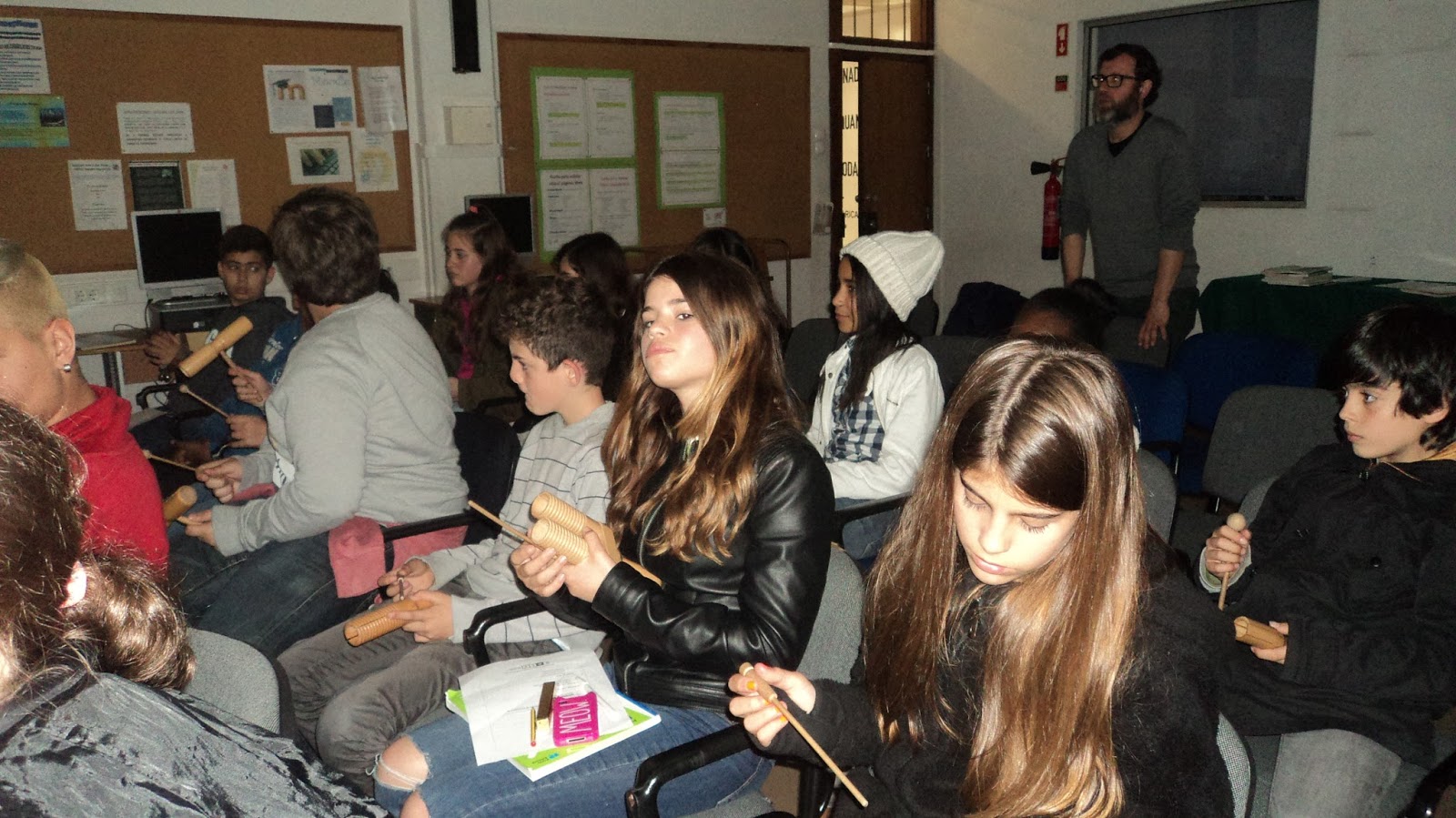A musicóloga da Fonoteca, Drª. Isabel Novais fez uma apresentação em power point e trouxe instrumentos musicais  para as duas sessões,  apelando à participação musical dos alunos, ao mesmo tempo que  os conduzia  numa viagem no tempo através da música e dos poetas que marcaram a "banda sonora" dos anos em volta do 25 de Abril.